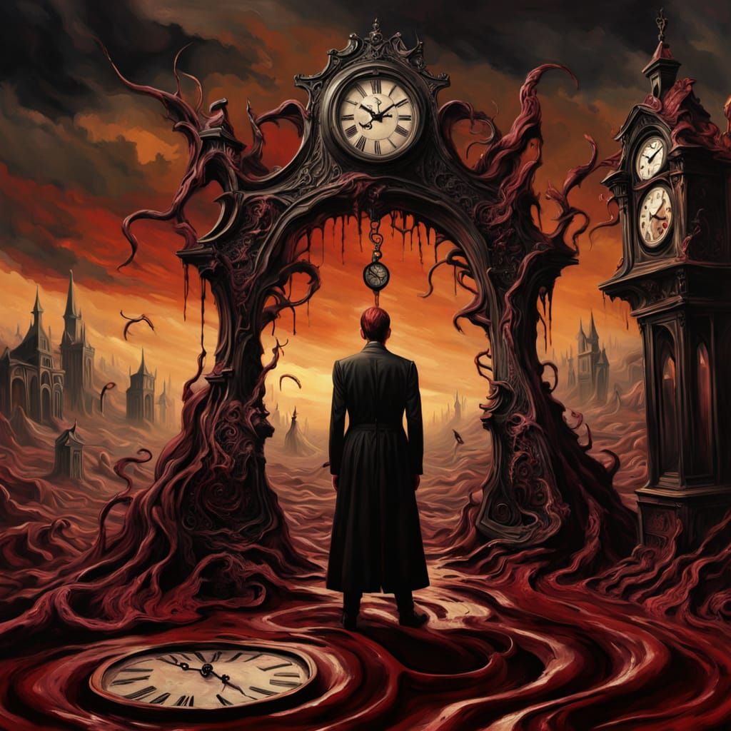A striking picture of a figure in Gothic clothing in a surreal landscape. Oil painting style with melting elements, distorted clocks, and ominous shadows. The scene is cast in vivid crimson hues.