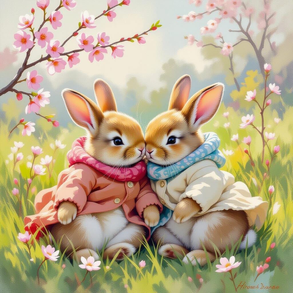 A charming image of two baby bunnies snuggled together in a flower-filled meadow. Delicate plum blossoms float on the breeze in this impressionistic scene.