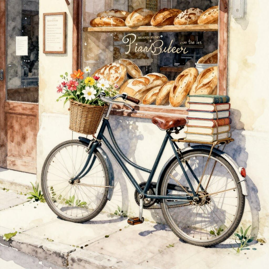 This image captures a charming Italian bread store with an antique bicycle adorned with flowers. Weeds grow through the sidewalk, adding a rustic touch. Rendered in watercolor and alcohol ink.