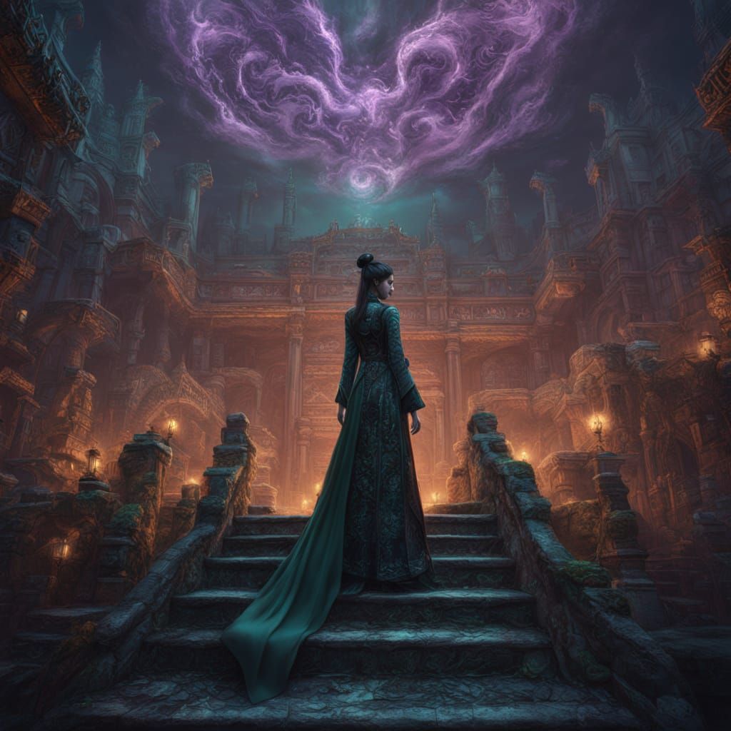 A mystical, goth princess is surrounded by swirling patterns and vibrant colors in this detailed, fantasy concept art piece, featuring intricate designs, soft glow, and subtle textures.