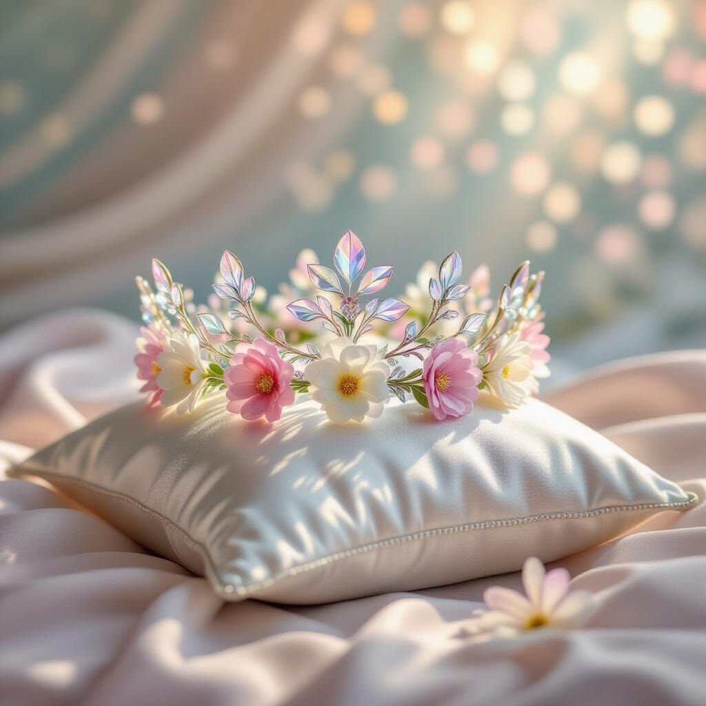 This image shows a delicate crown of glass and flowers on a silk pillow. It features a soft, fairytale aesthetic with gentle colors and ethereal light, rendered in a luminous digital painting style.