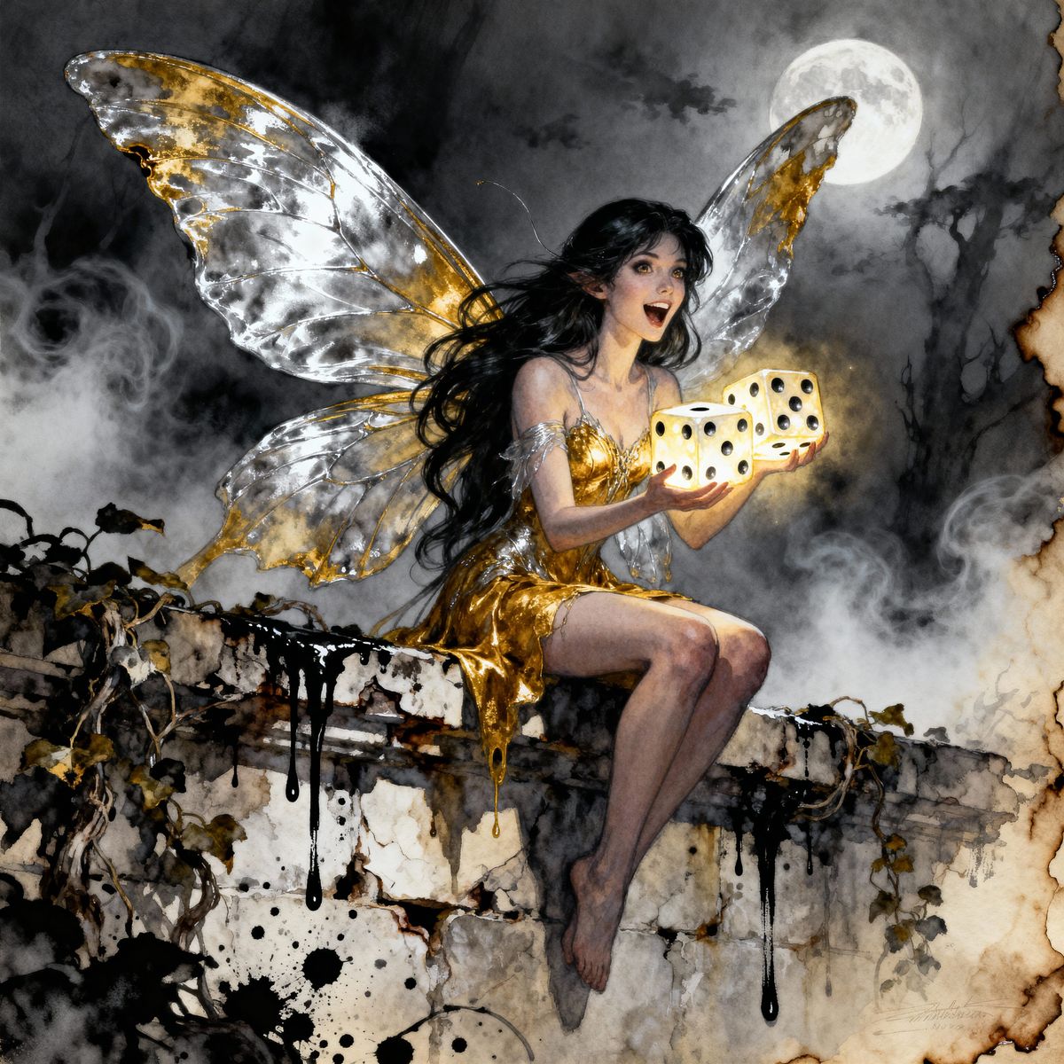 A detailed fantasy artwork featuring a faerie with shimmering wings on a stone wall, holding glowing dice. Rendered with ink splatter and watercolor on parchment, in dark tones with ethereal highlights.