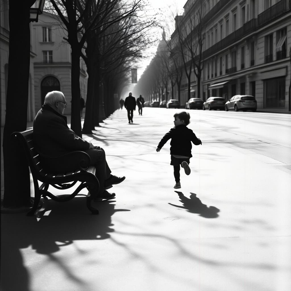 This image is a masterful capture of a decisive moment on a Parisian boulevard, with a child's shadow merging with an elderly man's on a bench. Shot with a Leica M3 and Tri-X 400 film, it exudes fine grain and stark contrasts, reminiscent of 20th-century documentary photography.