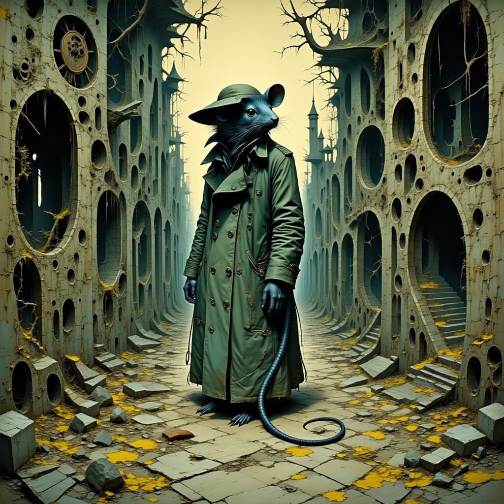 <lora:Si Jasta 2:1.0> <lora:Akimora:1.0> Imagine a lone, grizzled, anthropomorphic rat detective, clad in a tattered trench coat, standing amidst the ruins of a once-great clockwork city. Overgrown with vines and rust, the city's intricate gears and cogs lie silent, frozen in time. The badger's keen ...