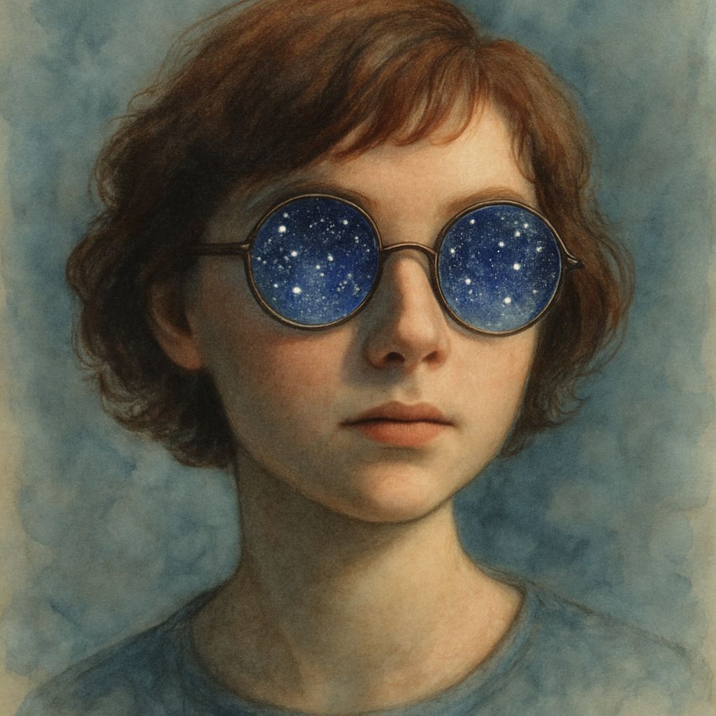 A striking picture of a young woman with auburn hair and glasses. The lenses of her glasses act as portals to shimmering constellations, all rendered in a surreal pastel aesthetic.