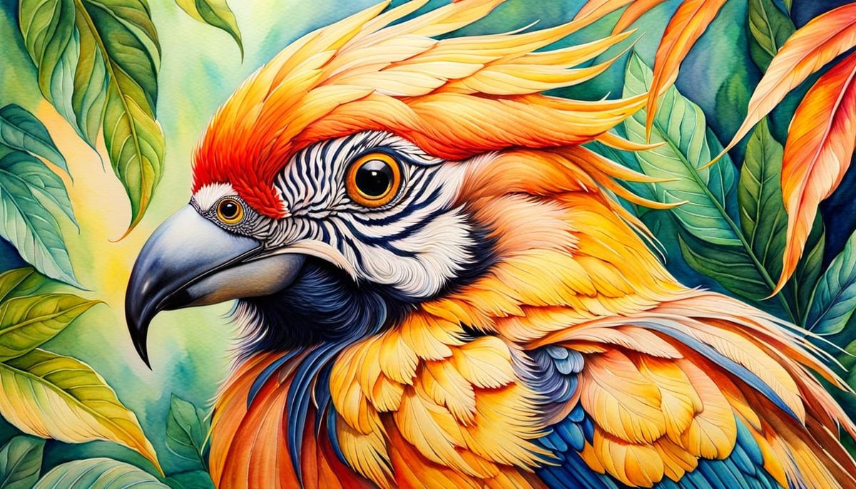 A close-up watercolor painting of an exotic bird amidst lush foliage. The artwork showcases vibrant colors, delicate feather textures, and warm, golden lighting in a dreamy watercolor aesthetic.