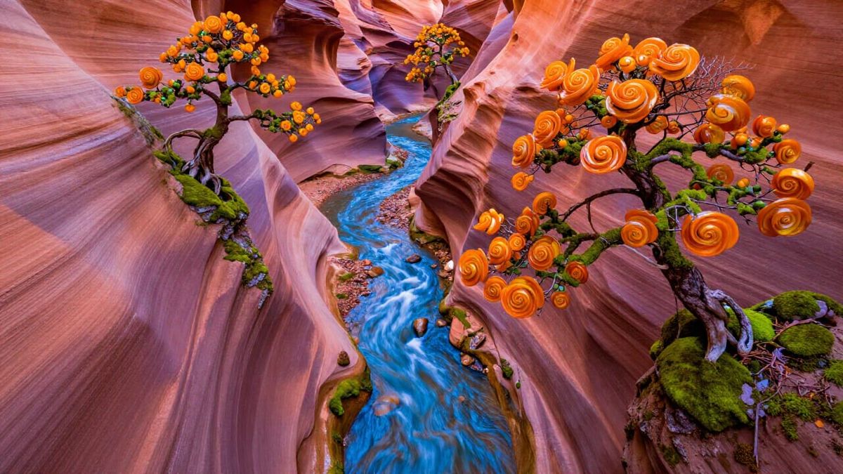 Generate unique Antelope Canyon and bonsai tree images with moss, a blue river, and vibrant colors. Free and easy AI art creation.