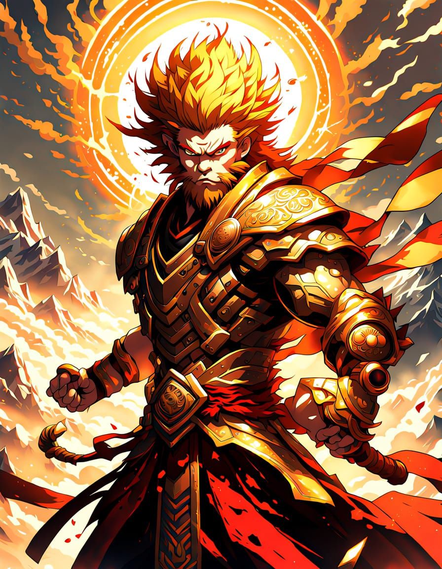 A dynamic anime splash art depiction of Wukong, the trickster god, on a mountain peak with golden hour lighting. His divine power and mischievous grin are captured with vibrant colors and expressive shading.
