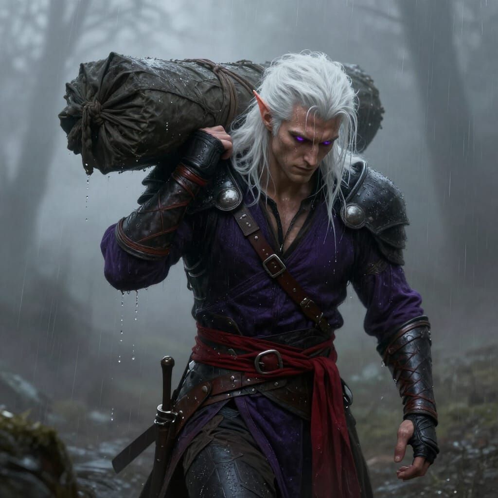 A striking image of a wet, muscular elf warrior with white hair and violet eyes, dressed in leather and purple. Rendered in a moody, painterly dark fantasy concept art style.