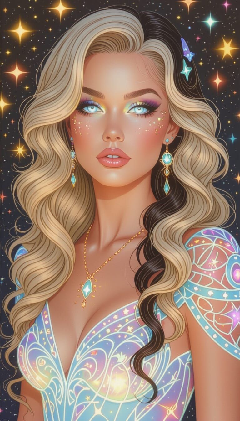 A vibrant 3D chalk art portrait of a beautiful enchantress under a starry night. She has turquoise eyes and glam rock makeup, wearing a blue gown adorned with celestial symbols. The image has a psychedelic spacepunk aesthetic.
