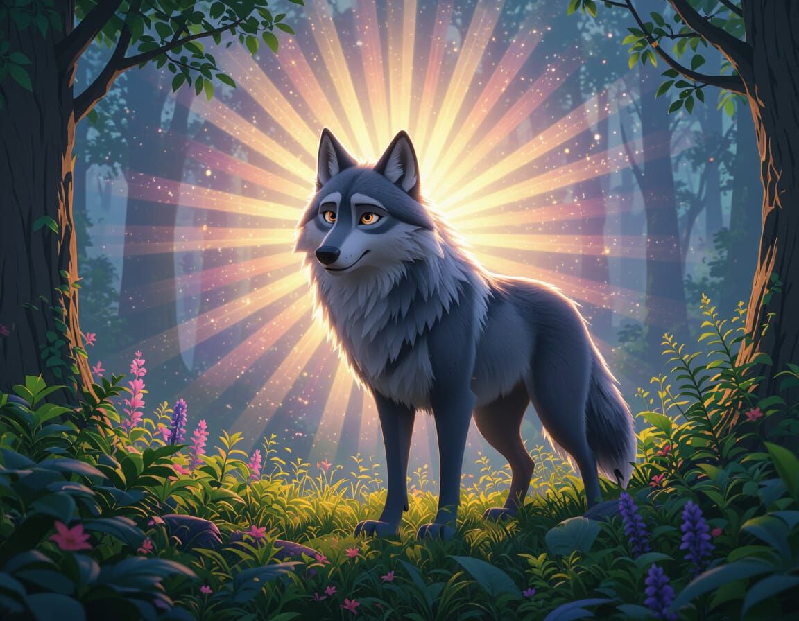 This image shows a majestic wolf standing in a mystical forest filled with lush plants. The artwork is rendered as 3D digital art with cinematic lighting and vibrant colors.