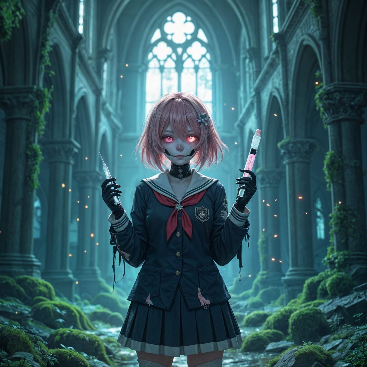 A digital painting of a girl with pink hair in a ruined cathedral. She wears a mask and holds a syringe in a scene of ethereal light, rendered with meticulous detail and dramatic atmosphere.