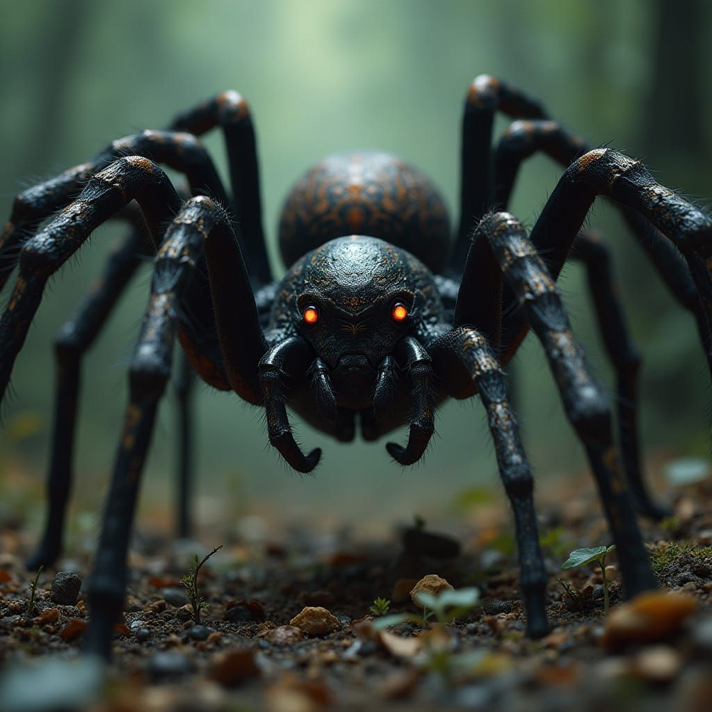 A cinematic film still of a colossal spider featuring a dark chitinous exoskeleton and pearlescent abdomen. Stiff, silver reflective bristles cover a segmented, muscular body in a Giger-esque style.