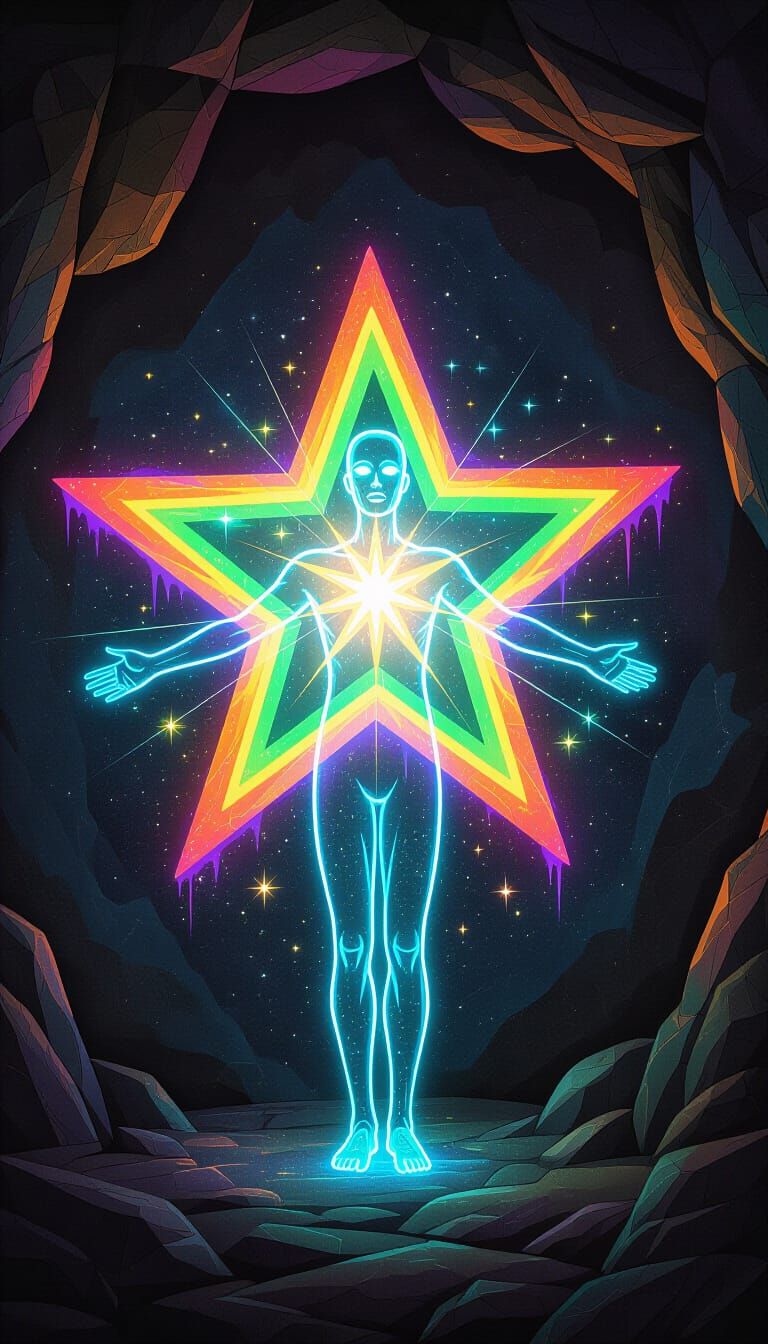 This image showcases a vibrant cave painting of a glowing humanoid figure at the center, intertwined with a multicolored five-pointed star. Rendered with phosphorescent pigments, it has an ancient, mystical feel.