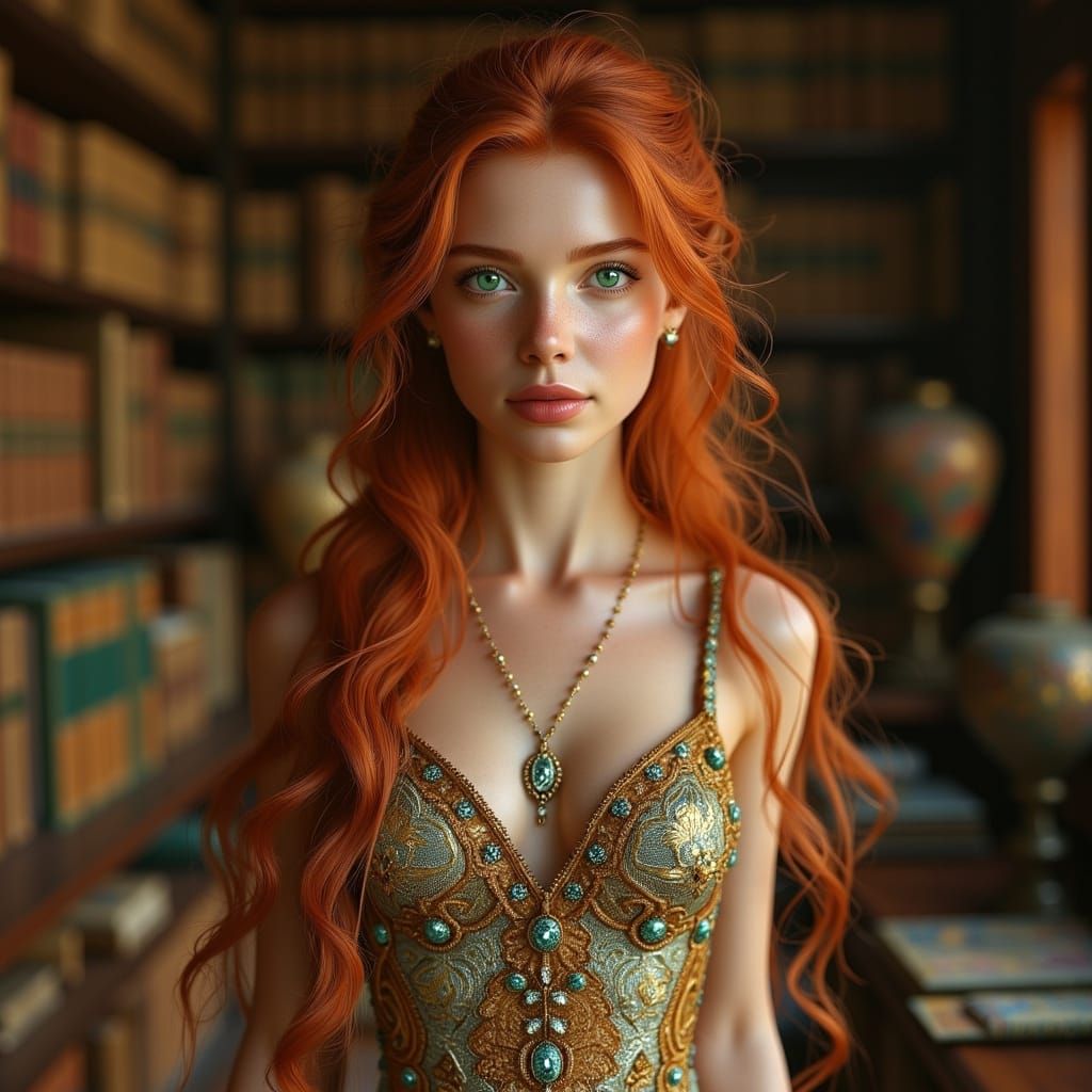 La polvere dorata danzava nell'aria immobile, catturando i raggi di sole che filtravano pigramente. Un leggero profumo di carta antica e cera d'api aleggiava nell'ambiente, mentre la donna, con un'espressione pensierosa, sfiorava con delicatezza il dorso di un libro...