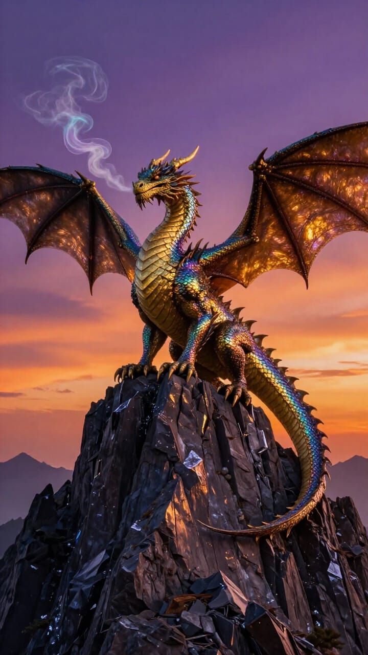 This image shows a majestic dragon with iridescent scales on an obsidian mountain. Golden hour light creates an ethereal glow against a purple and orange sky, with mystical fantasy concept art style.