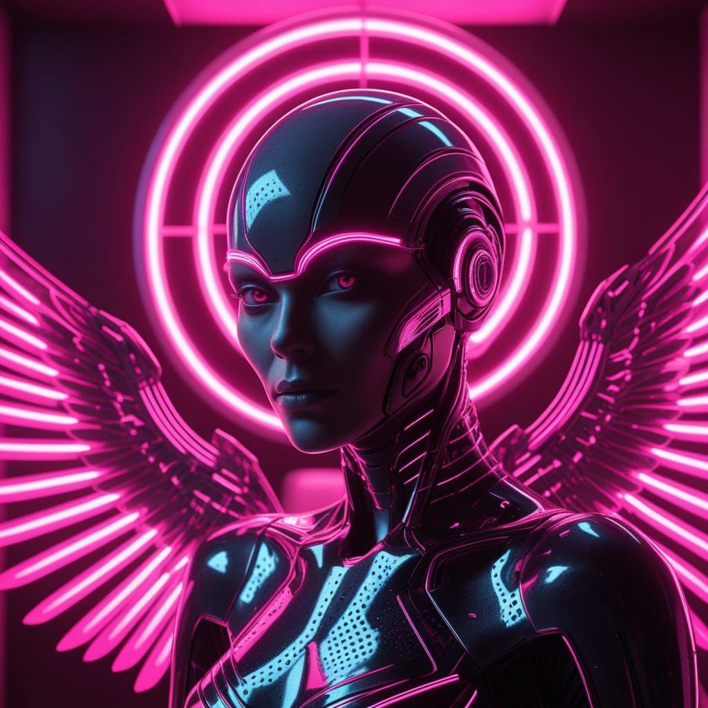A close-up portrait of an alien cybernetic angel with intricate wings, bathed in brilliant neon pink light. The image features detailed textures and a photorealistic style.