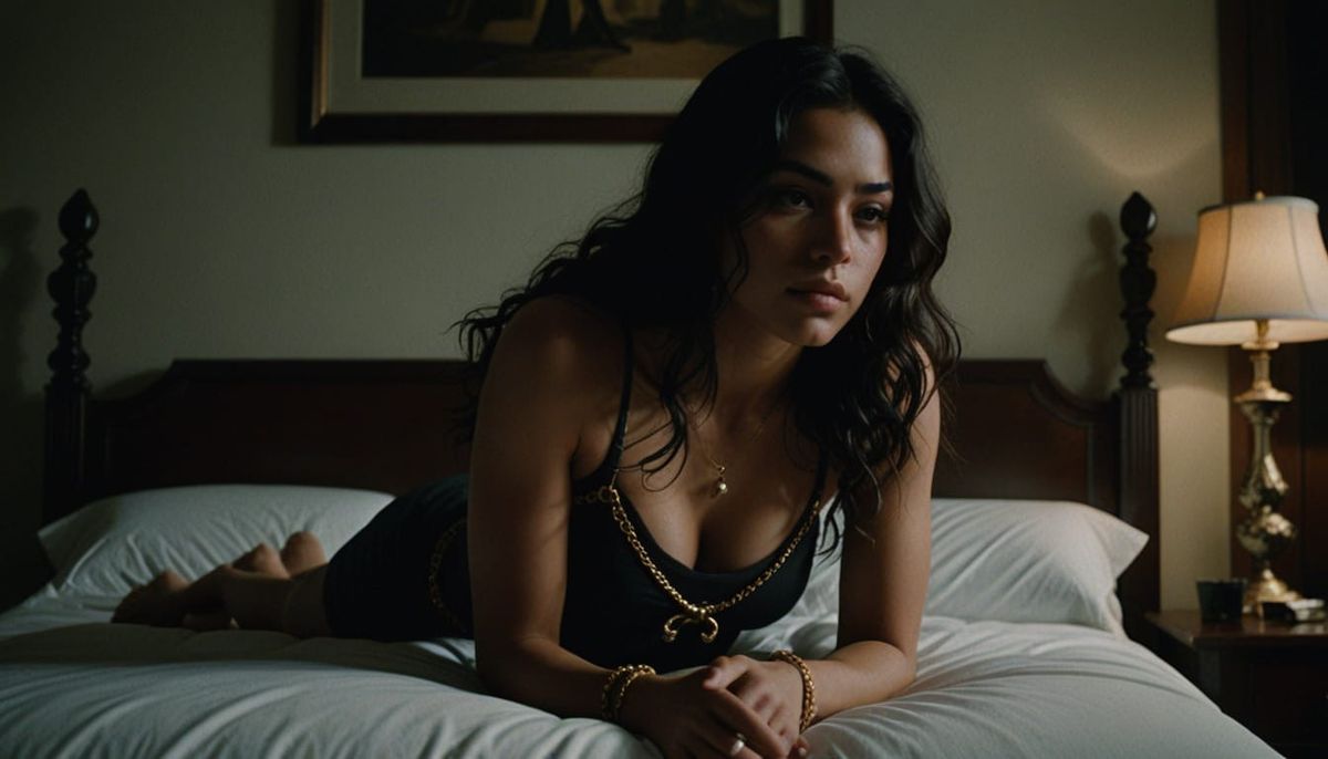 Cinematic portrait of a 23-year-old Mexican woman with an athletic build, sensually posed on a bed. Golden chains adorn her body, contrasting with athletic wear. Shot with dramatic lighting and noir aesthetic.