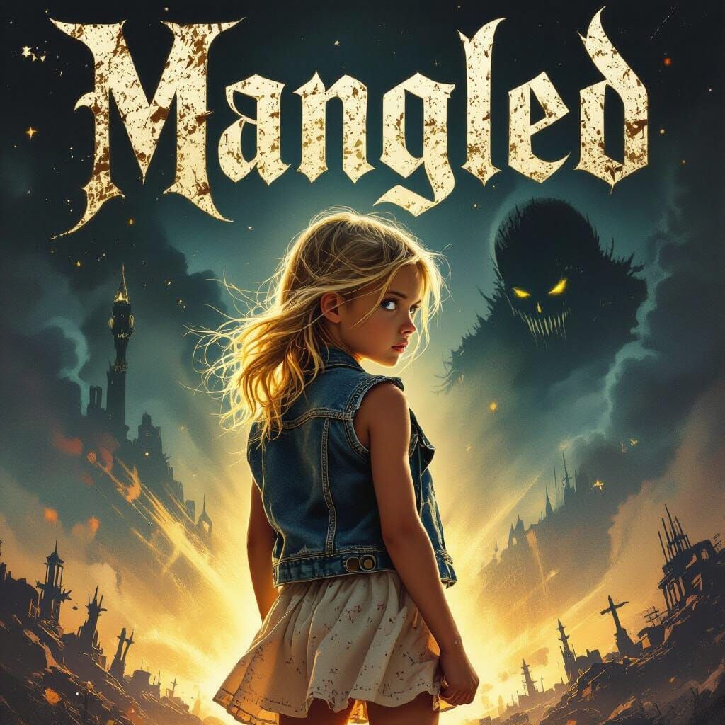 This cinematic movie poster features a young girl in a heroic pose, bathed in golden light against a dark, apocalyptic backdrop. The title 'Mangled' appears in gothic lettering. Dark fantasy art style.