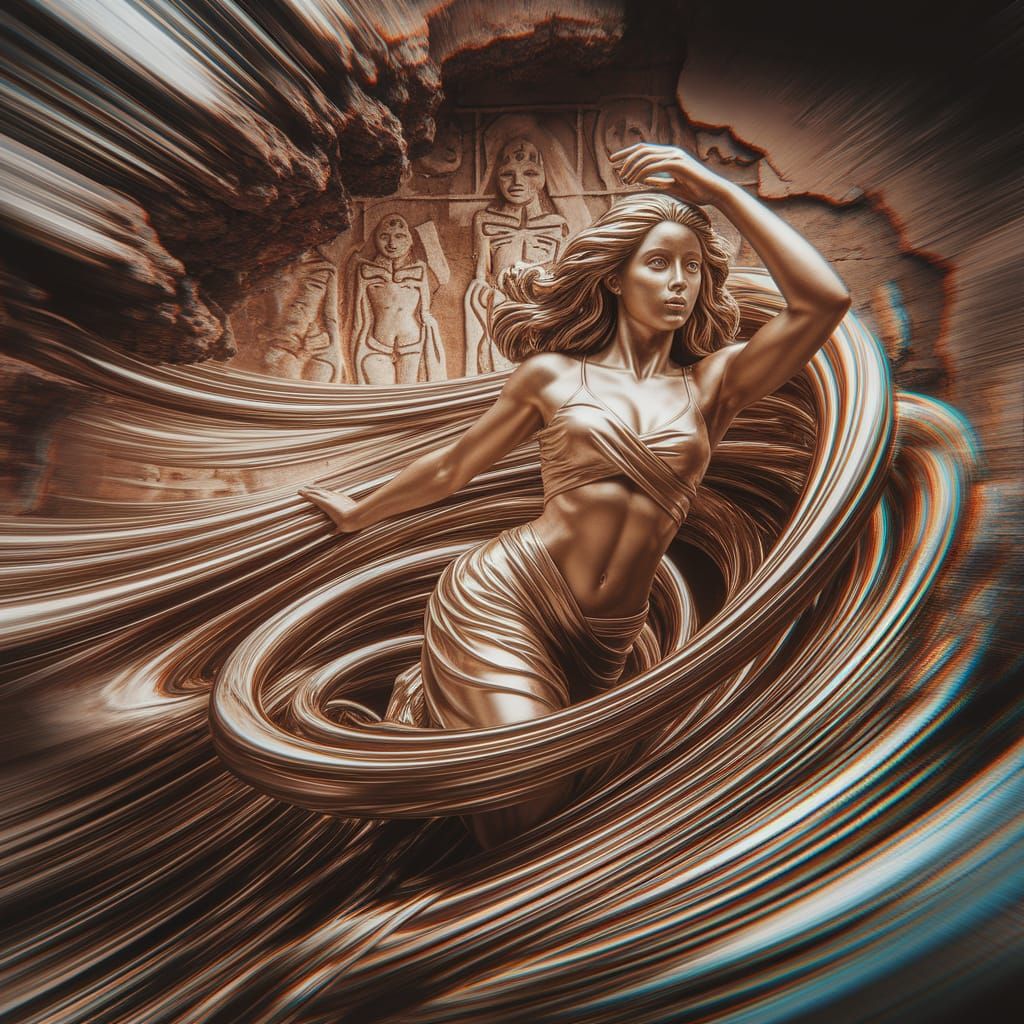 A digital rendering of a semi-gilded statue of a beautiful young woman. The statue is carved in a tribal petroglyph style and surrounded by swirling psychedelic colors, with recursive hypnotic distortions.