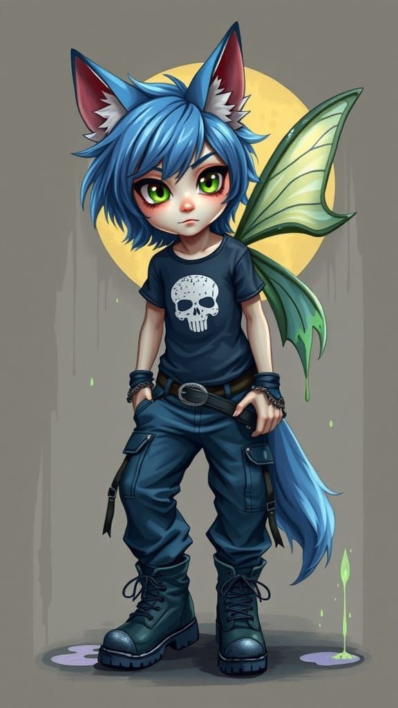 adorable wolf-like fairy with green -blue eyes wearing gothic clothing, blue baggie cargo pants and skull on the t-shirt, blue hair, boots D...