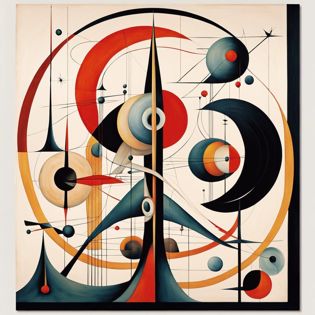 Create a stunning, framed painting on a wall in a living room, using the imaginative world of Hieronymus Boschβs intricate, otherworldly details. Incorporate the sleek elegance of Isamu Noguchi's modern design sensibilities, merging them with the bold geometry and opulence of Art Deco. The painting ...