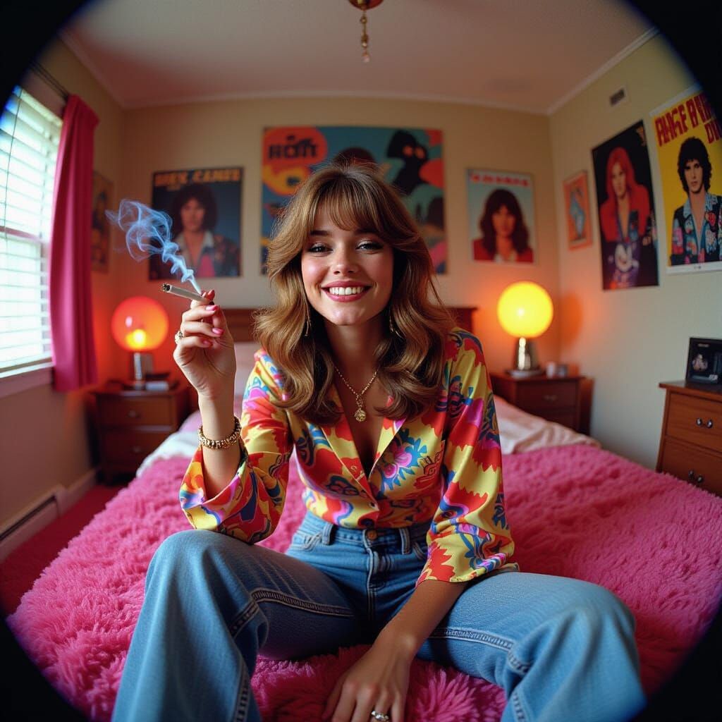 A young woman in a 1970s outfit smirks while holding a cigarette in her retro bedroom. The image captures a grainy, lo-fi aesthetic with a warm, nostalgic color palette.
