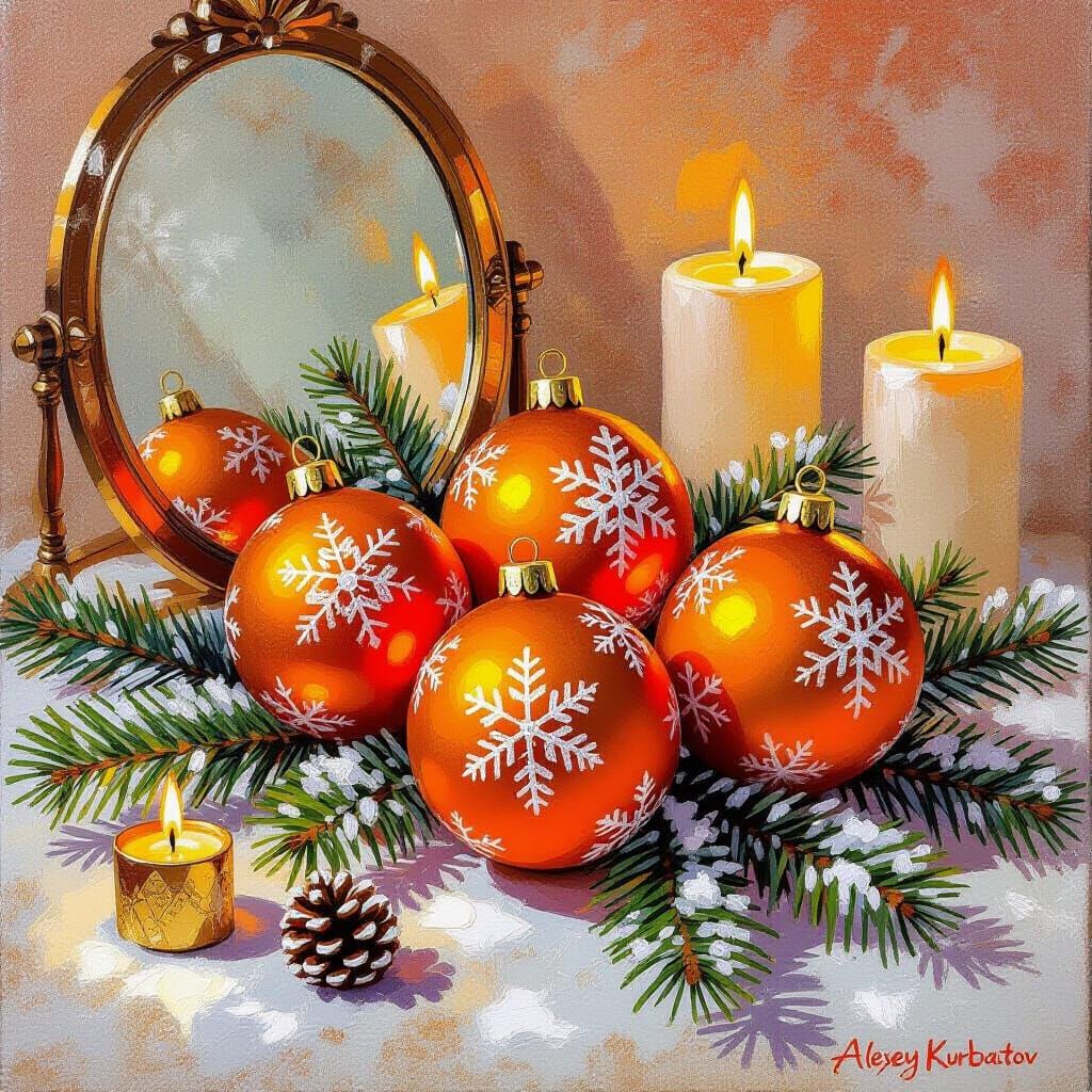A macro still life of vibrant orange Christmas ornaments with snowflakes and glitter on fir branches, featuring a mirror and candles. Rendered in a vintage, neo-impressionist oil painting style with thick, colorful acrylic textures.