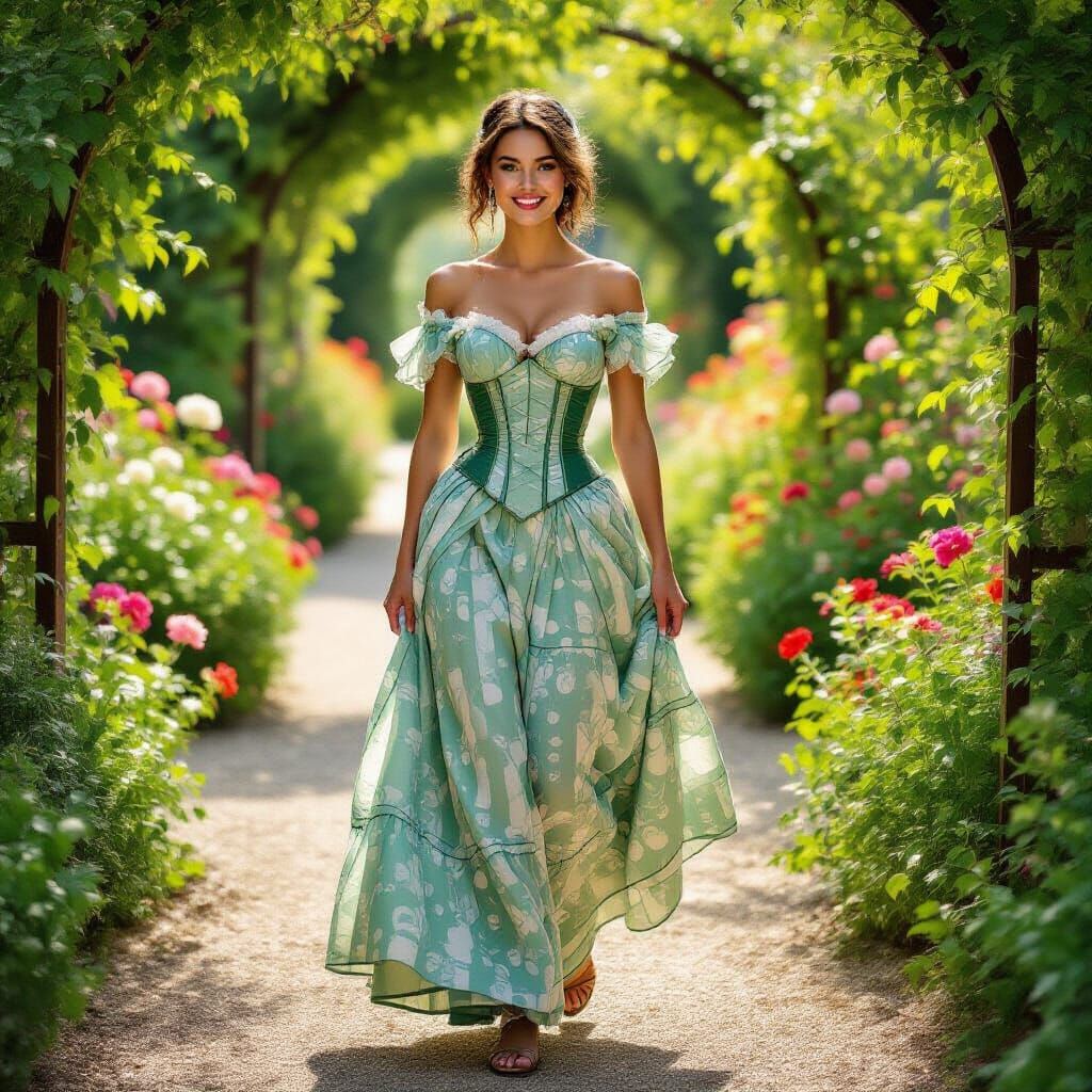 A hyperrealistic image of an elegant European woman in a light green and yellow striped corset dress, walking along a flower-lined garden path. The artwork evokes art nouveau aesthetics.