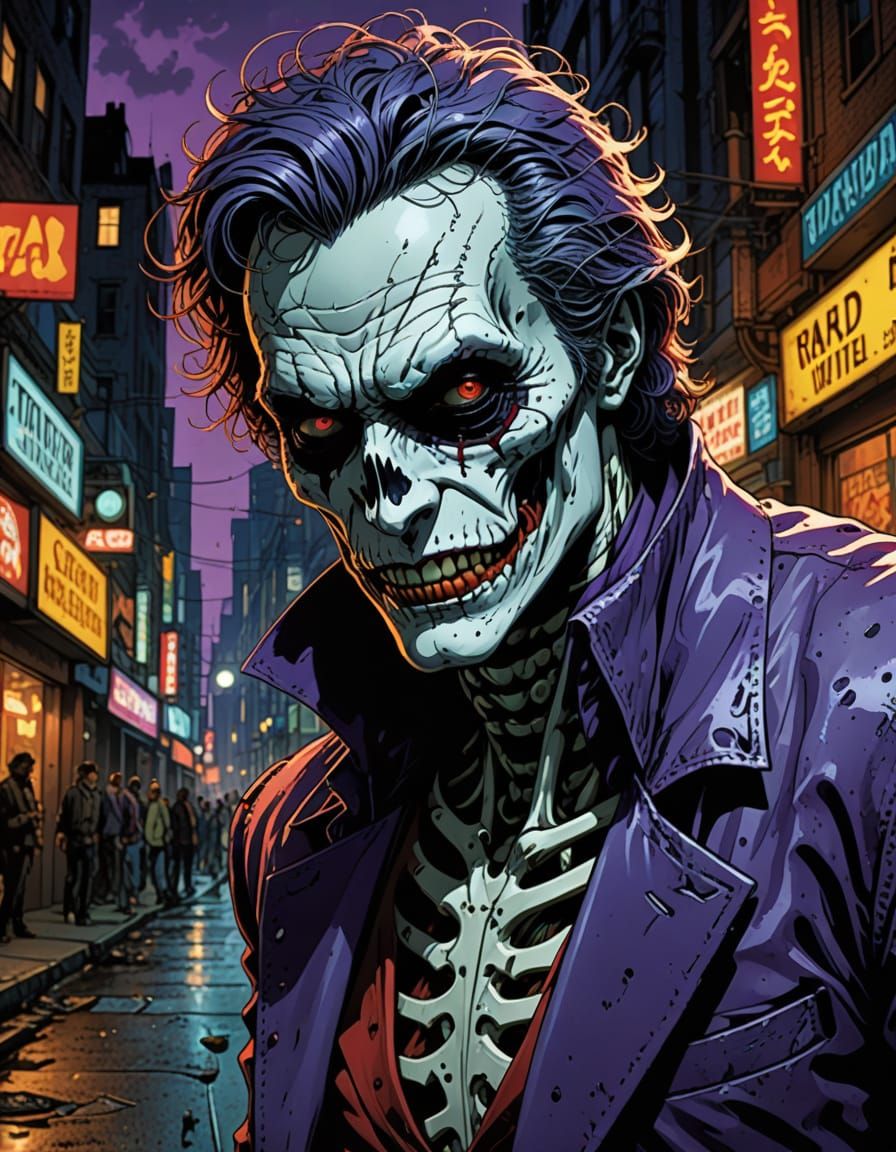 This image depicts a skeleton with Joker makeup smashing through a dark city street in a graphic novel illustration style, featuring vibrant colors and sharp contrast.