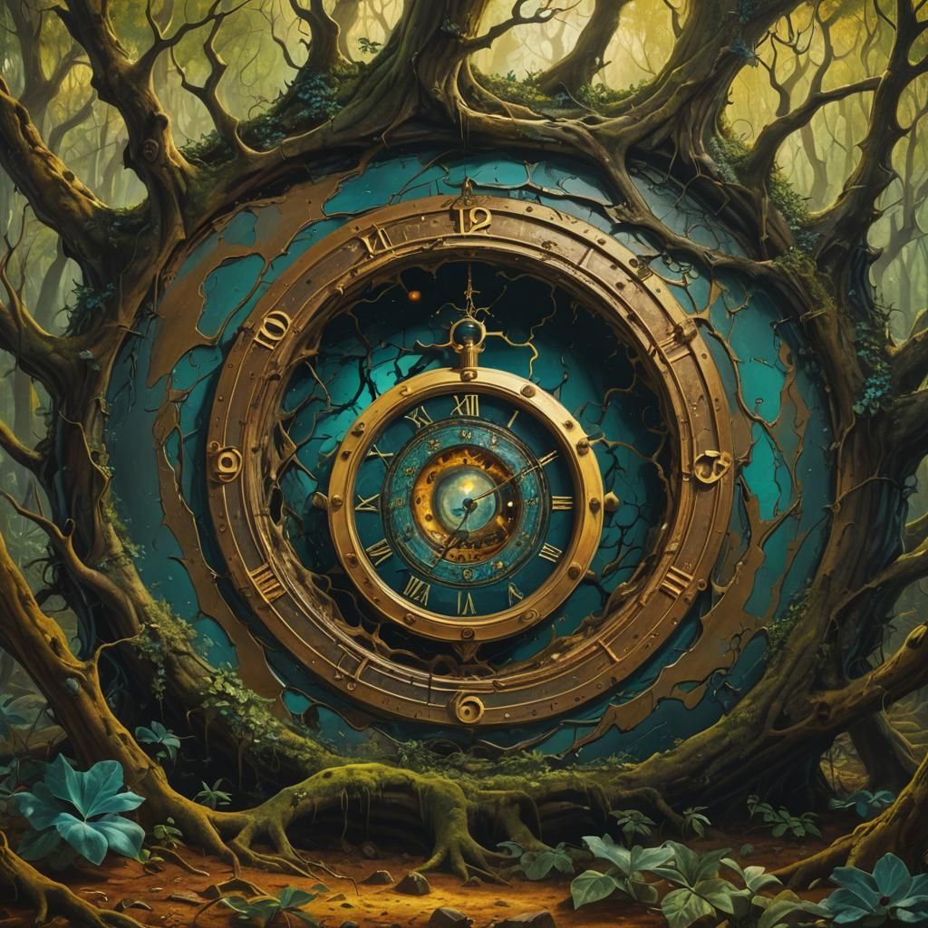 This image shows a surrealist painting of time in a forest. The artwork uses glitch art techniques and oil on canvas to create a fantastical and intricate scene.