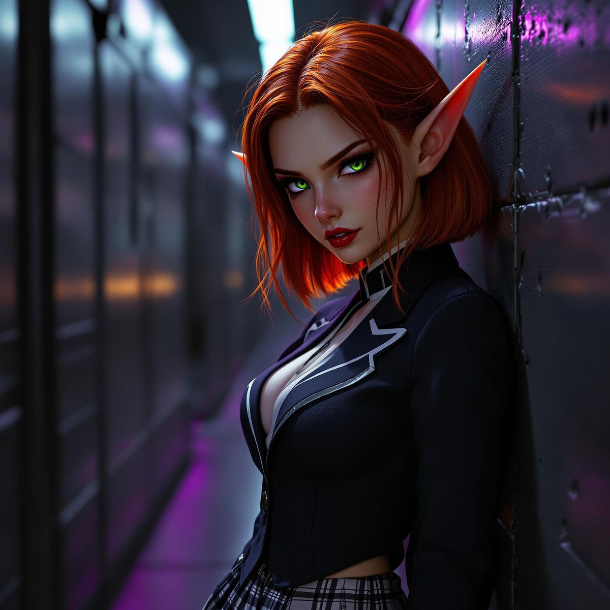 This image showcases a striking elf girl with fiery red hair and piercing green eyes, exuding confidence and intensity. Clad in a sleek school uniform, she leans against a metallic wall, radiating a bold, futuristic atmosphere with intricate textures and vibrant purple and yellow hues.