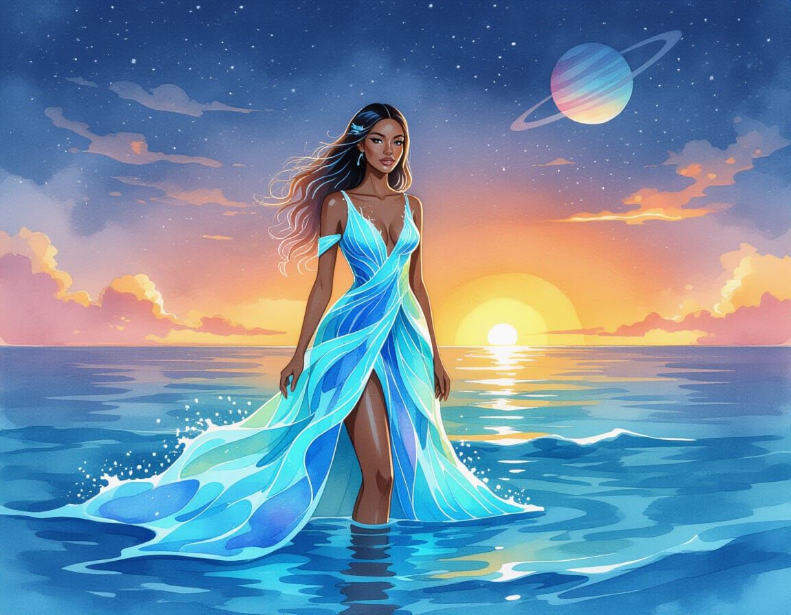 This image shows an alien woman standing in the sea at sunset. She is wearing a bioluminescent blue dress that resembles ocean waves, painted in a watercolor style.