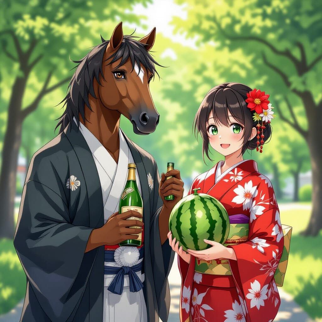This image depicts a centaur-like man in a kimono enjoying a summer park with a woman. The artwork is rendered in a detailed, brightly colored anime style, with cinematic lighting, reminiscent of Studio Trigger.