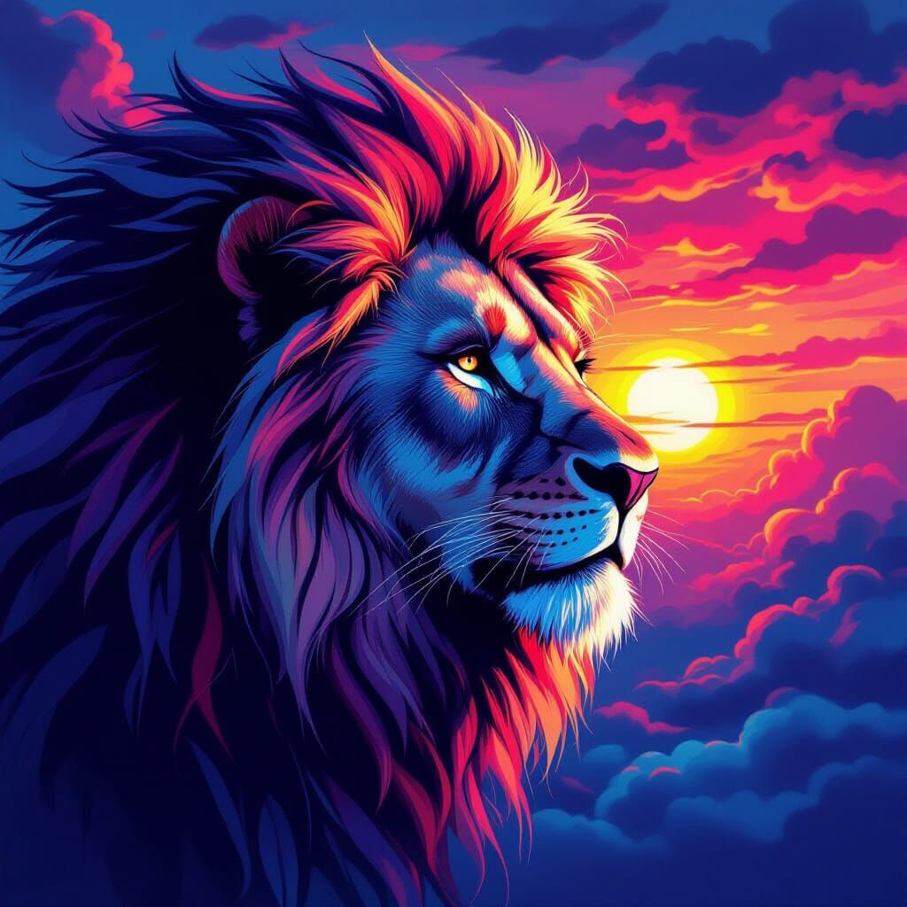 A vibrant image of a lion's head and mane merged with a neon sunrise. The artwork features swirling details and a smooth texture in cerulean and raspberry hues, with a digital art aesthetic.