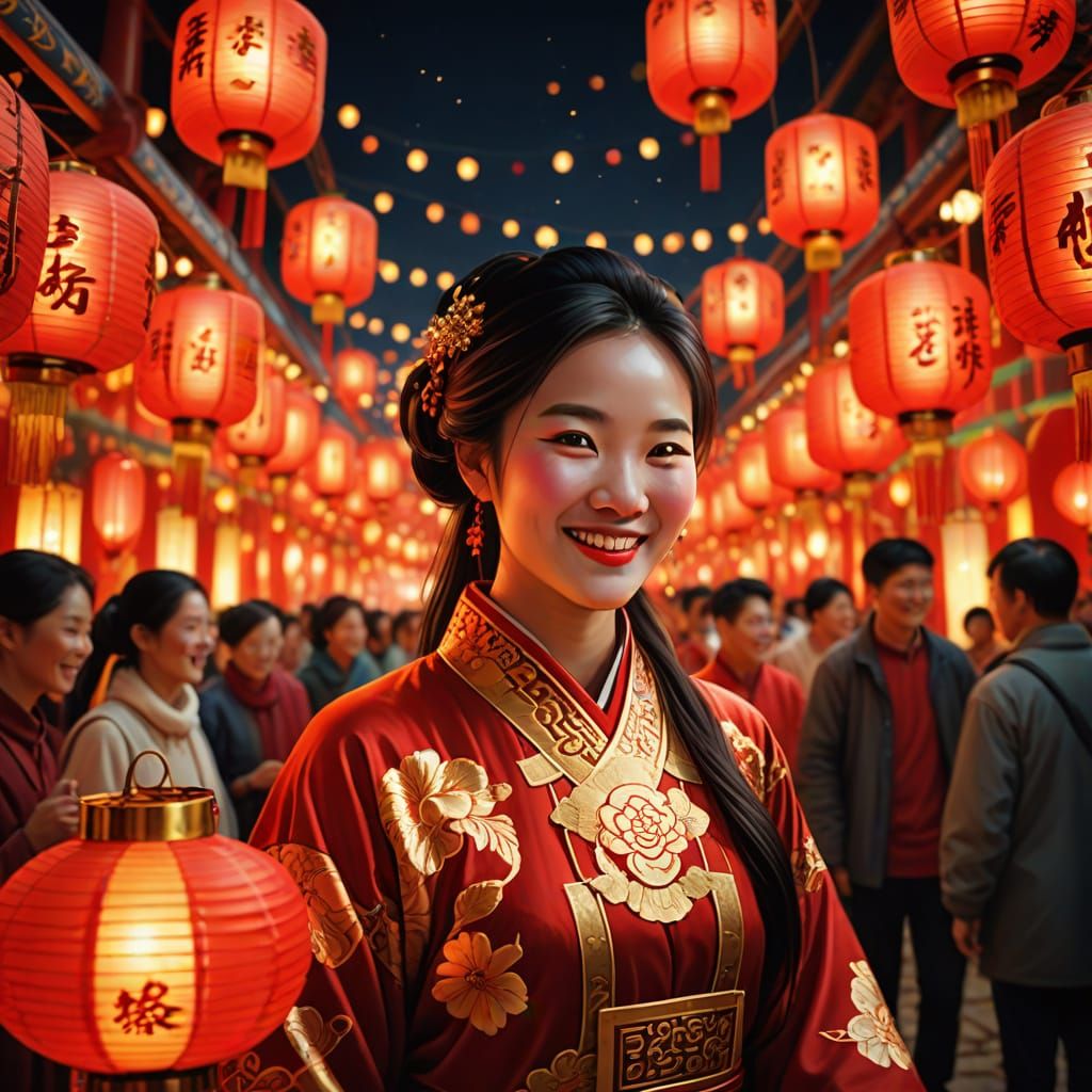 This image showcases a joyful celebration of traditional Chinese culture, featuring a woman in traditional attire holding a lantern amidst a vibrant festival setting, with intricate patterns and dynamic lighting.