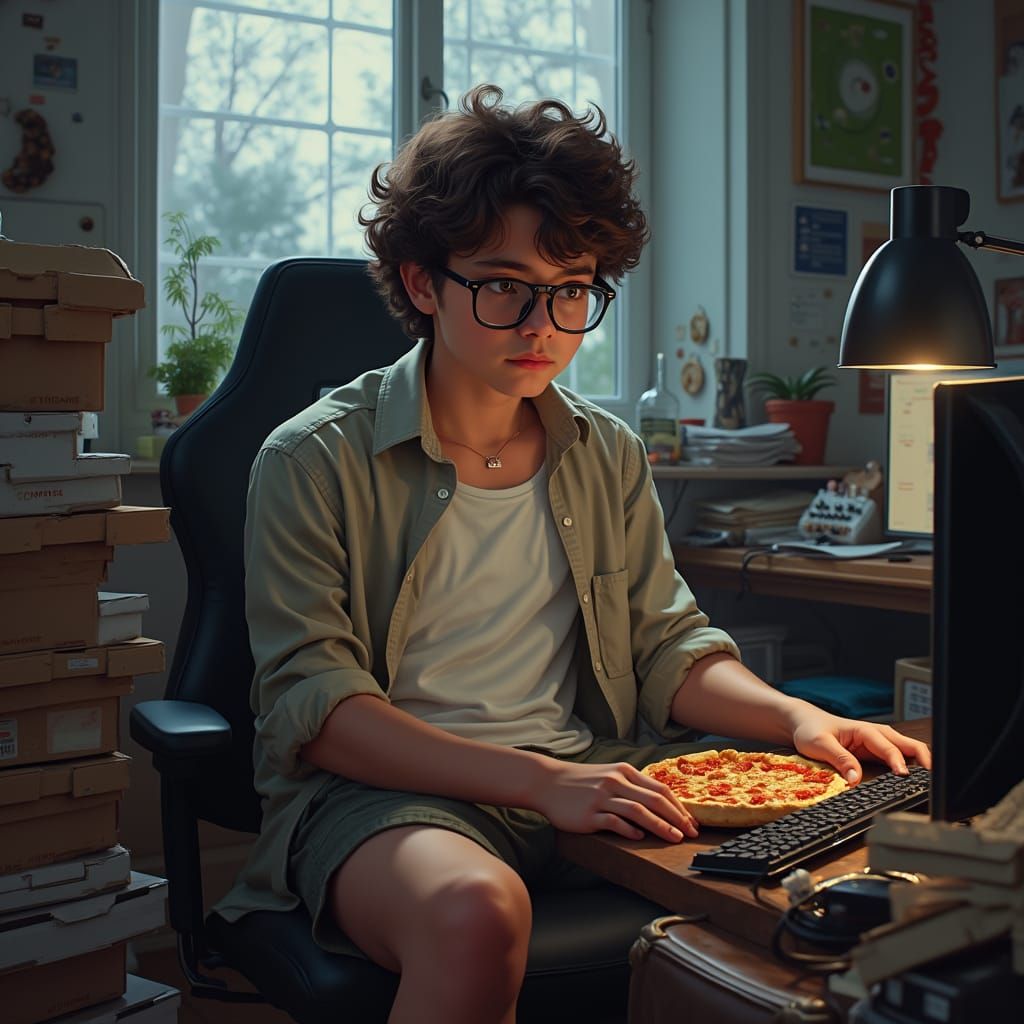 A hyper-realistic portrait of a teen gamer engrossed in their gaming computer, surrounded by gaming paraphernalia and junk food, in a photorealistic style with detailed environments and subtle lighting effects.