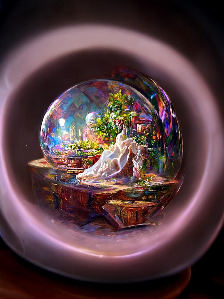 A striking picture of a rose encased in a crystal ball. This mixed media artwork features vivid colors, ethereal mist, and divine lighting, rendered with hyperdetailed 3D shading.