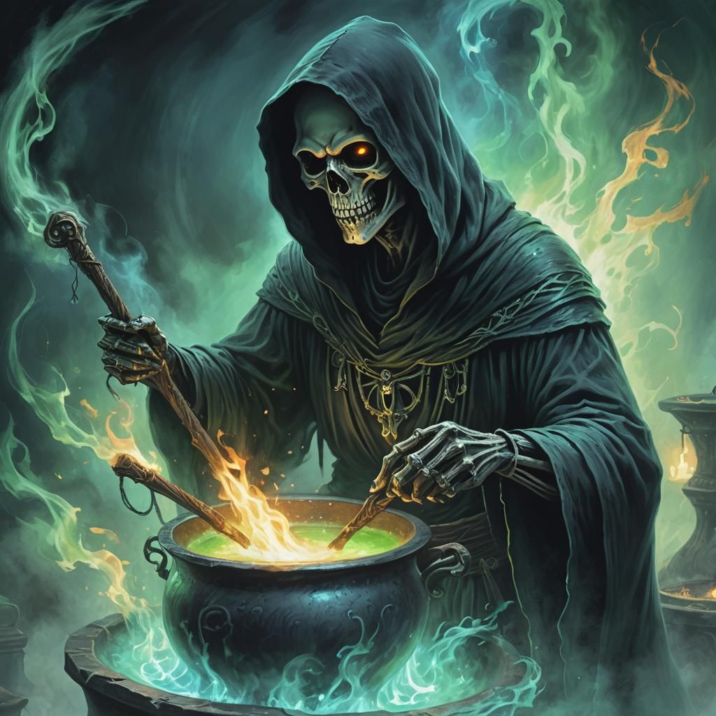 A close-up image of the Grim Reaper preparing a bubbling cauldron. Soul energy swirls upwards in a vibrant display of ethereal colors, creating a mystical and dreamlike dark fantasy scene.