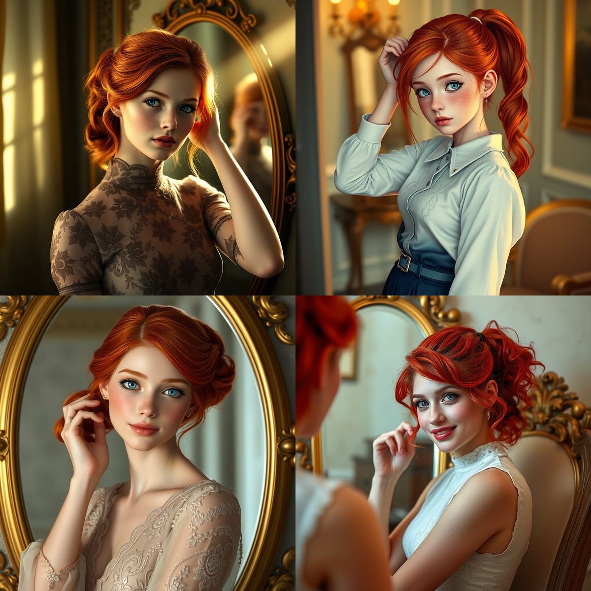 A detailed portrait of a red-haired girl with freckles preparing in front of a mirror. The image features dynamic lighting and intricate details, presented as trending art.