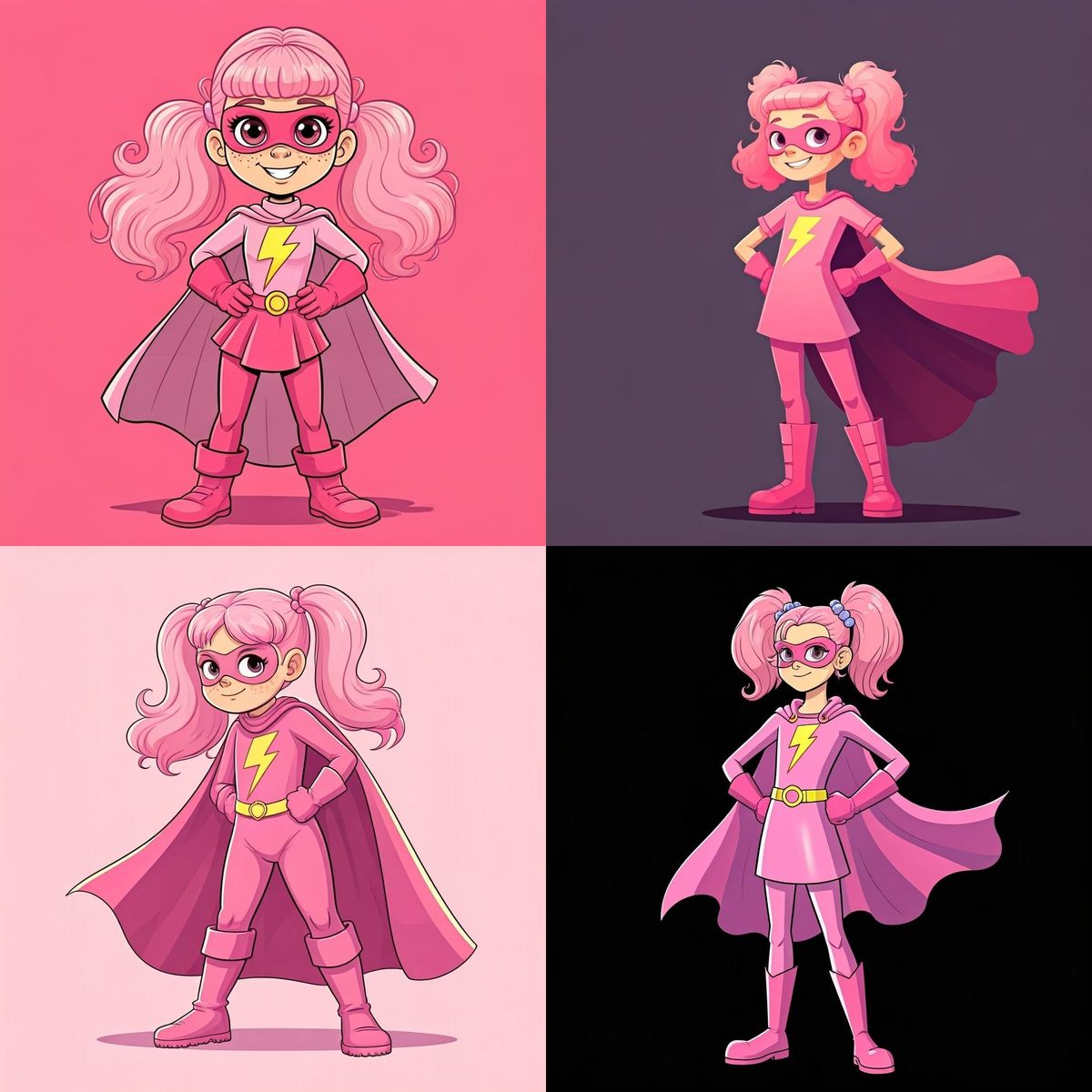 This vibrant image shows a young girl dressed as a superhero in a bright pink costume, complete with a lightning bolt emblem and flowing cape.