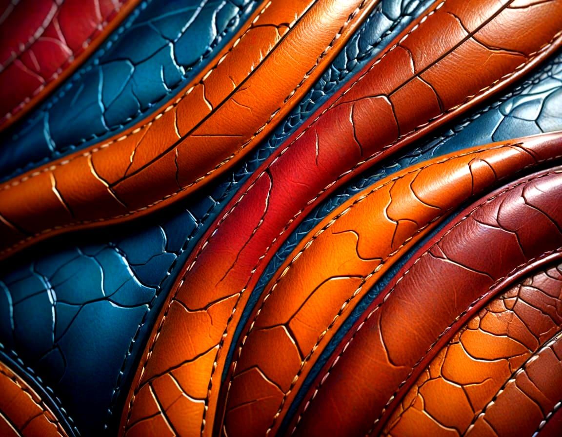 This image showcases a macro photograph of leather textures in various colors. The digital art features intricate stitches, glossy finishes, and soft backlight, rendered in a vibrant oil painting style.