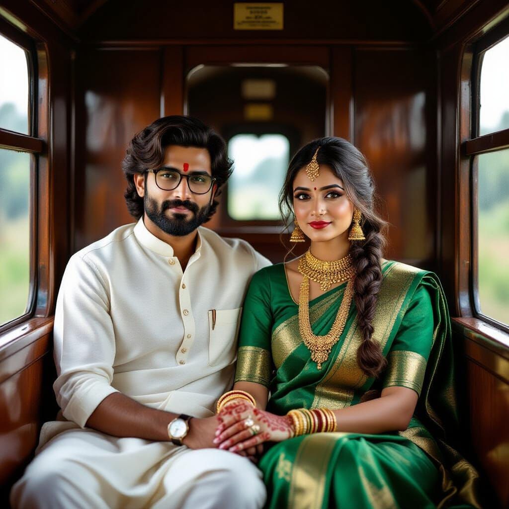 This image shows an Indian couple in a vintage train compartment, set in a traditional scene. The man is wearing a kurta pajama, and the woman is in a silk saree with elegant jewelry, rendered with dynamic lighting.