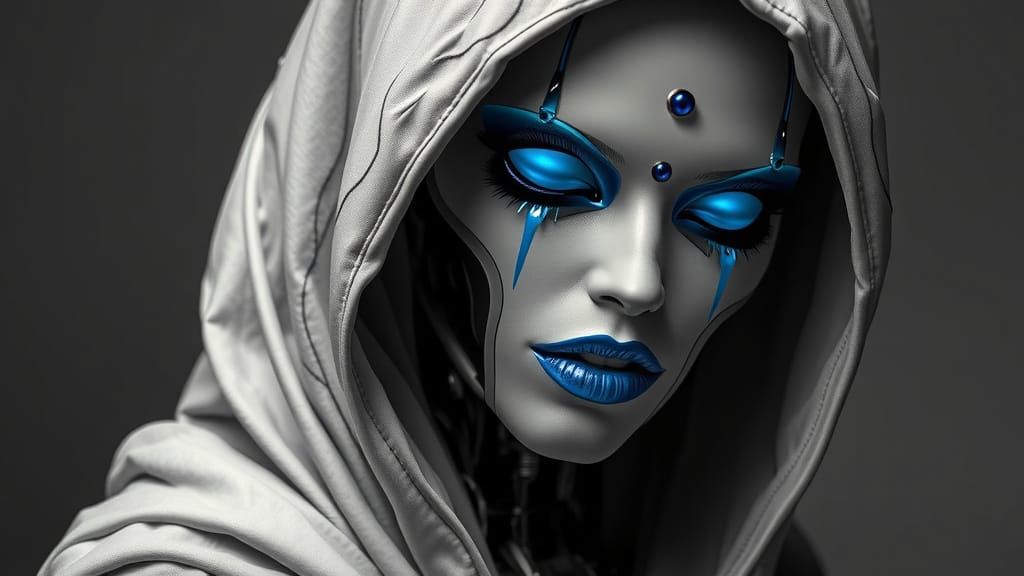 A striking monochrome portrait of a cyborg Grim Reaper, featuring striking blue lips against a gray aesthetic. This AI-generated image captures a unique blend of technology and mortality.