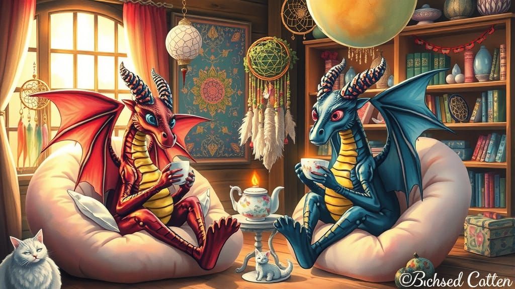 A gothic-hippie dragon Balloons sipping tea in a cozy cottage filled with plush beanbag chairs and twinkling fairy lights, while a little ki...