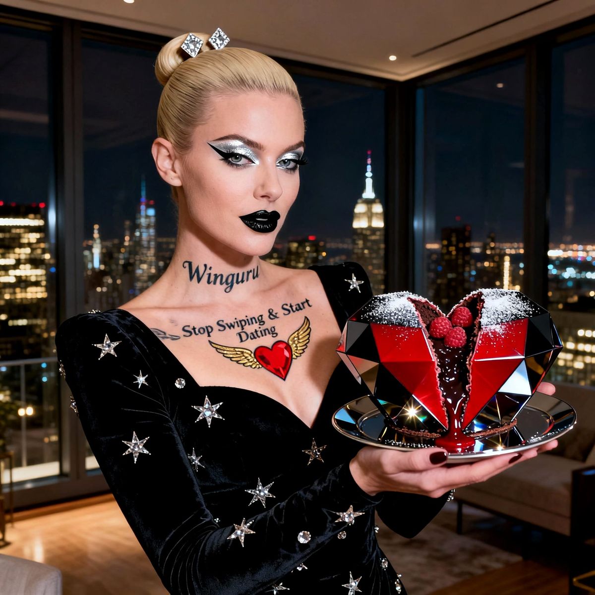 A striking editorial shot features a blonde woman in a black velvet gown adorned with crystals. A geometric dessert with molten filling reflects a glowing city skyline.