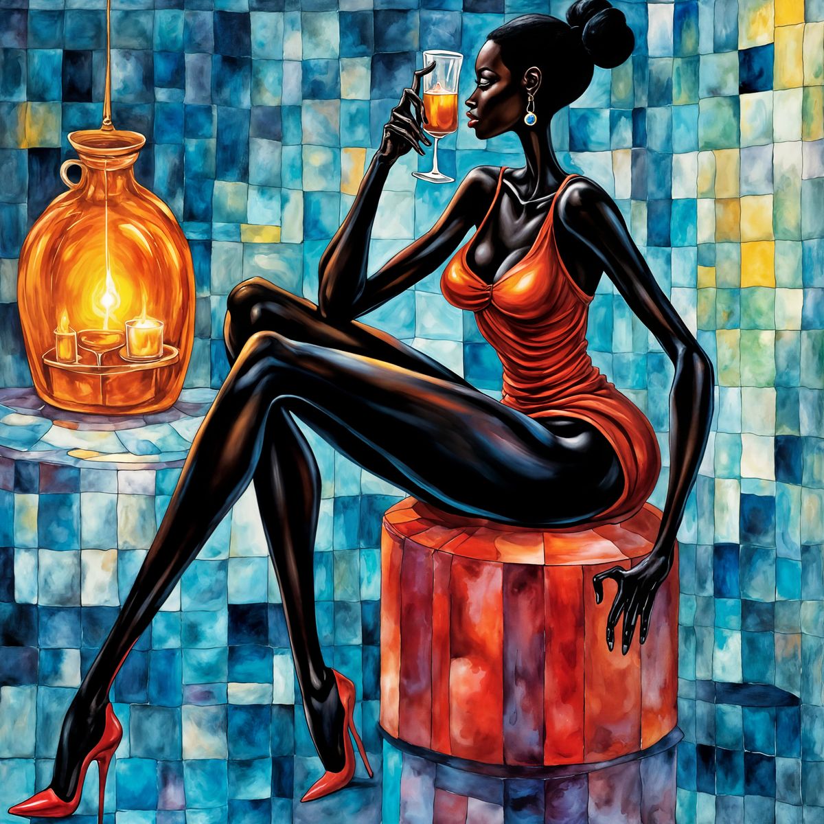 This image showcases a sensual, slim Black woman in a glamorous avant-garde style, featuring Prussian Blue hues and energy diffraction effects.