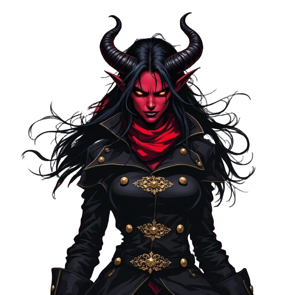 This image depicts a fierce, dark-skinned tiefling woman with wild black hair and sharp horns, wearing a detailed black leather jacket with gold buttons and a flowing red scarf. Inspired by Anime and Manga styles, this artwork showcases vibrant colors and dynamic movement.