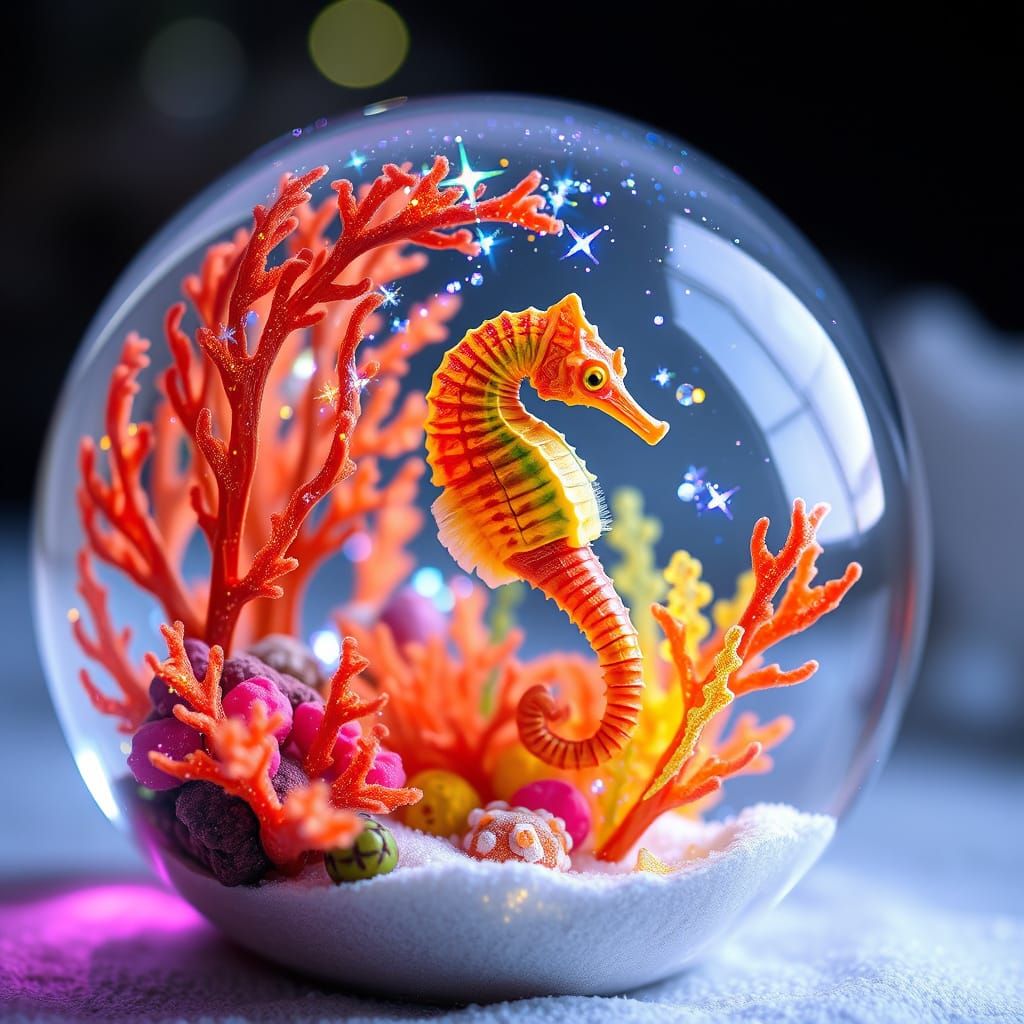 A vibrant seahorse swims among glowing coral inside a glass orb. This image captures a fantastical underwater scene with luminescent flora, resembling a snowglobe.