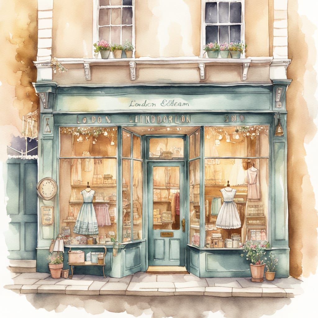 This charming watercolor illustration captures a quaint London children's clothing shop filled with vintage dresses, warm golden light, and delicate textures, evoking a nostalgic and romantic atmosphere.